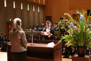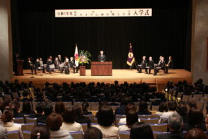 今年度から新たに就任された坂江千寿子学長の式辞、盛岡正博理事長、栁田清二佐久市長(代理:畠山啓二副市長)からの祝辞に続き、新入生代表として看護学部看護学科の秋山実生さんから新生活への決意が述べられ、閉式となりました。