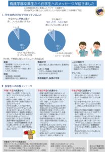 看護学部自己点検・評価部会では、卒業生が多く就職した10施設の卒後1・3・5年目の方にアンケートを依頼しました。調査へのご協力ありがとうございました。回答には、在学生へのメッセージとして、学生時代の過ごし方について、具体的なアドバイスや温かい応援にあふれていました。まとめを是非見てくださいね。