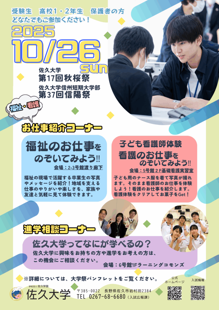 10月26日(日)に開催される大学祭では、「福祉・看護のお仕事紹介」や「進学相談」を行います。