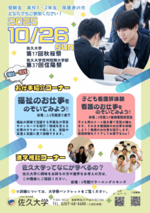 10月26日(日)に佐久大学「第17回秋桜祭」・佐久大学信州短期大学部「第37回信陽祭」開催に伴い、受験生のほか、高校1・2年生、保護者の方などを対象とした「福祉と看護のお仕事紹介コーナー」「子ども看護師体験」「進学相談コーナー」を下記のとおり出展いたします。