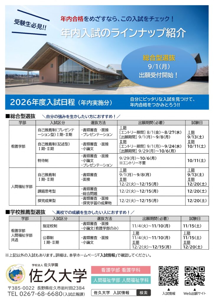 【受験生必見】年内入試(総合型選抜・学校推薦型選抜)のラインナップをご紹介! 年内合格をめざすなら、この入試をチェック! 9月1日(月)からは、いよいよ「総合型選抜」の出願受付が開始となります。 自分にピッタリな入試を見つけて、年内合格をつかみとろう!! ※「入試情報」はこちらから!